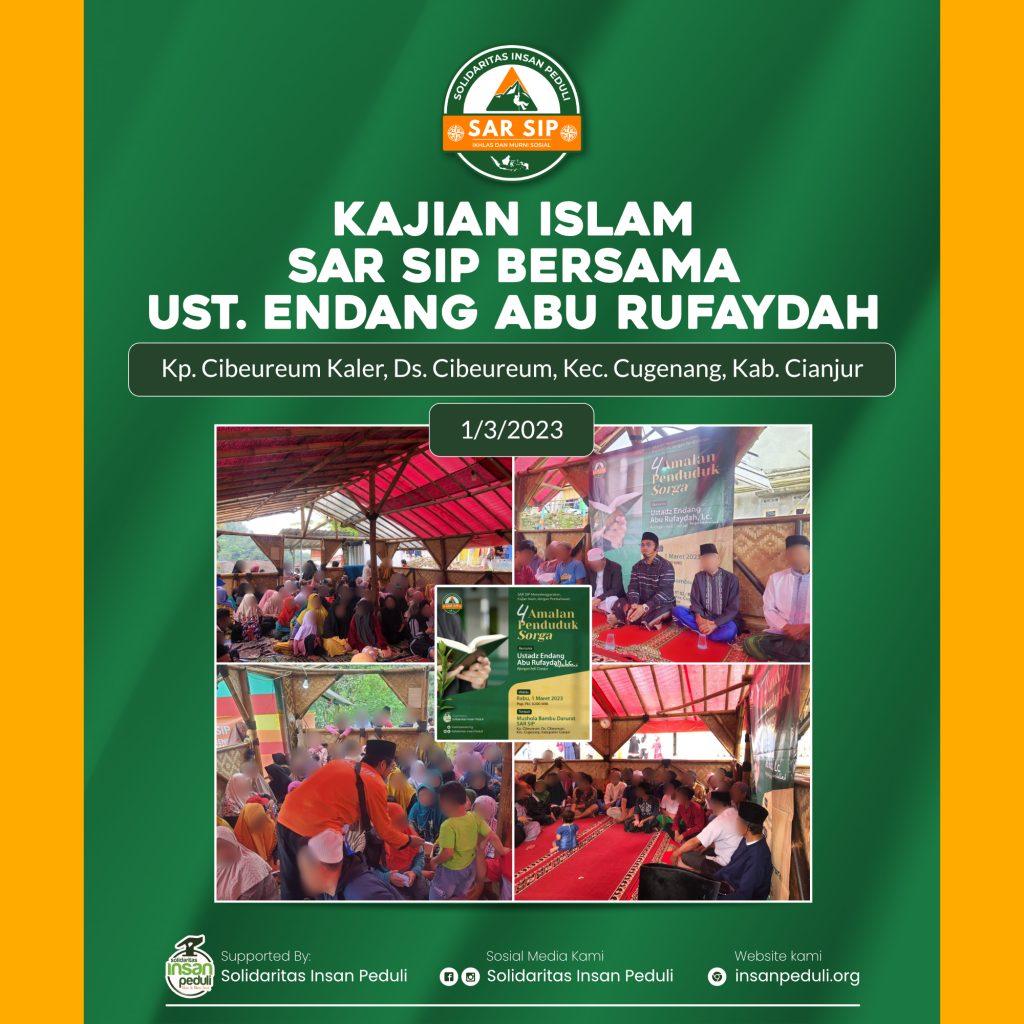 Kajian diisi oleh Ustadz Endang Abu Rufaydah, salah satu Ustadz asli Cianjur, dengan Judul “4 Amalan Penduduk Sorga”. Selepas kajian, tim SAR SIP membagikan bantuan untuk para jamaah yang datang ke mushola untuk menyimak kajian.
